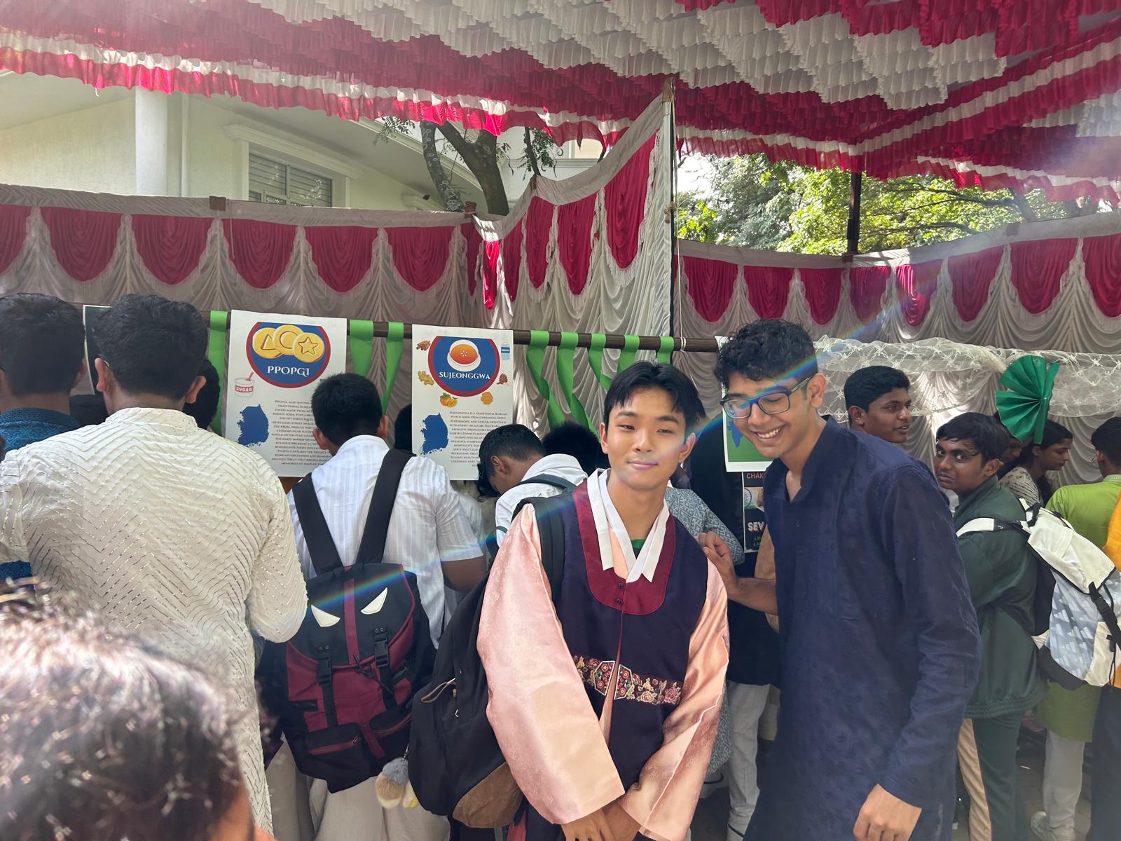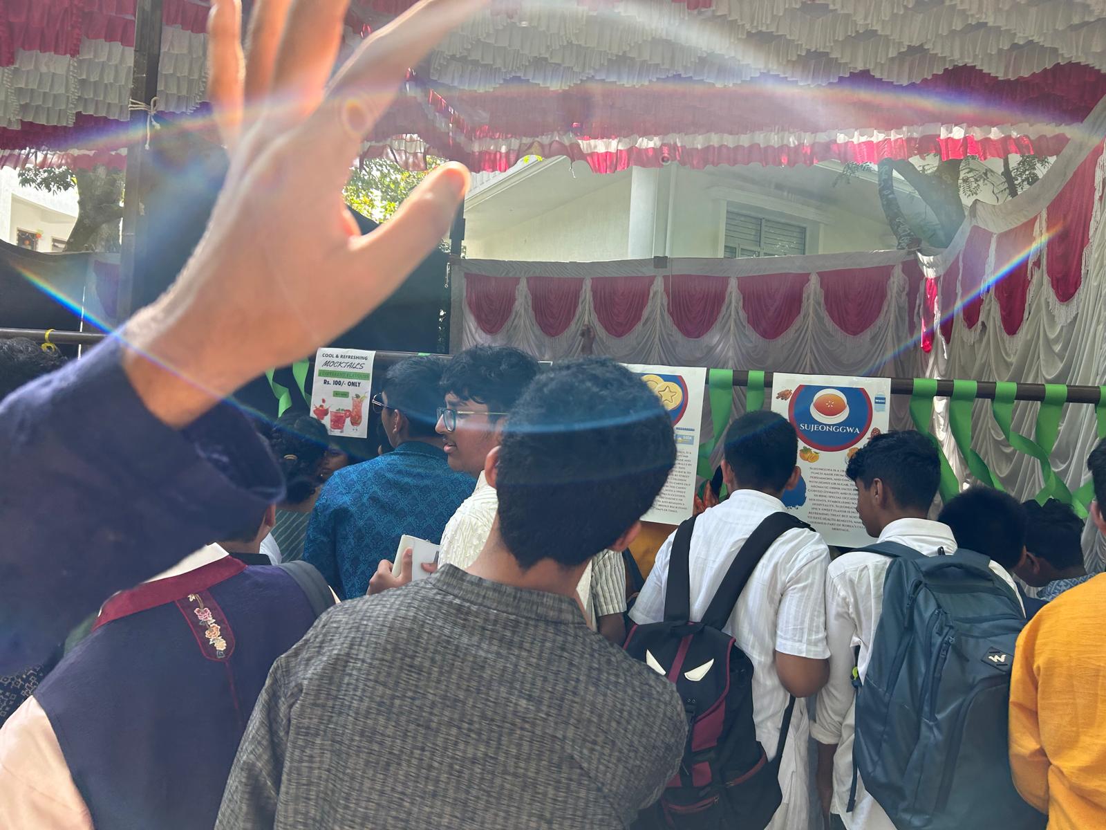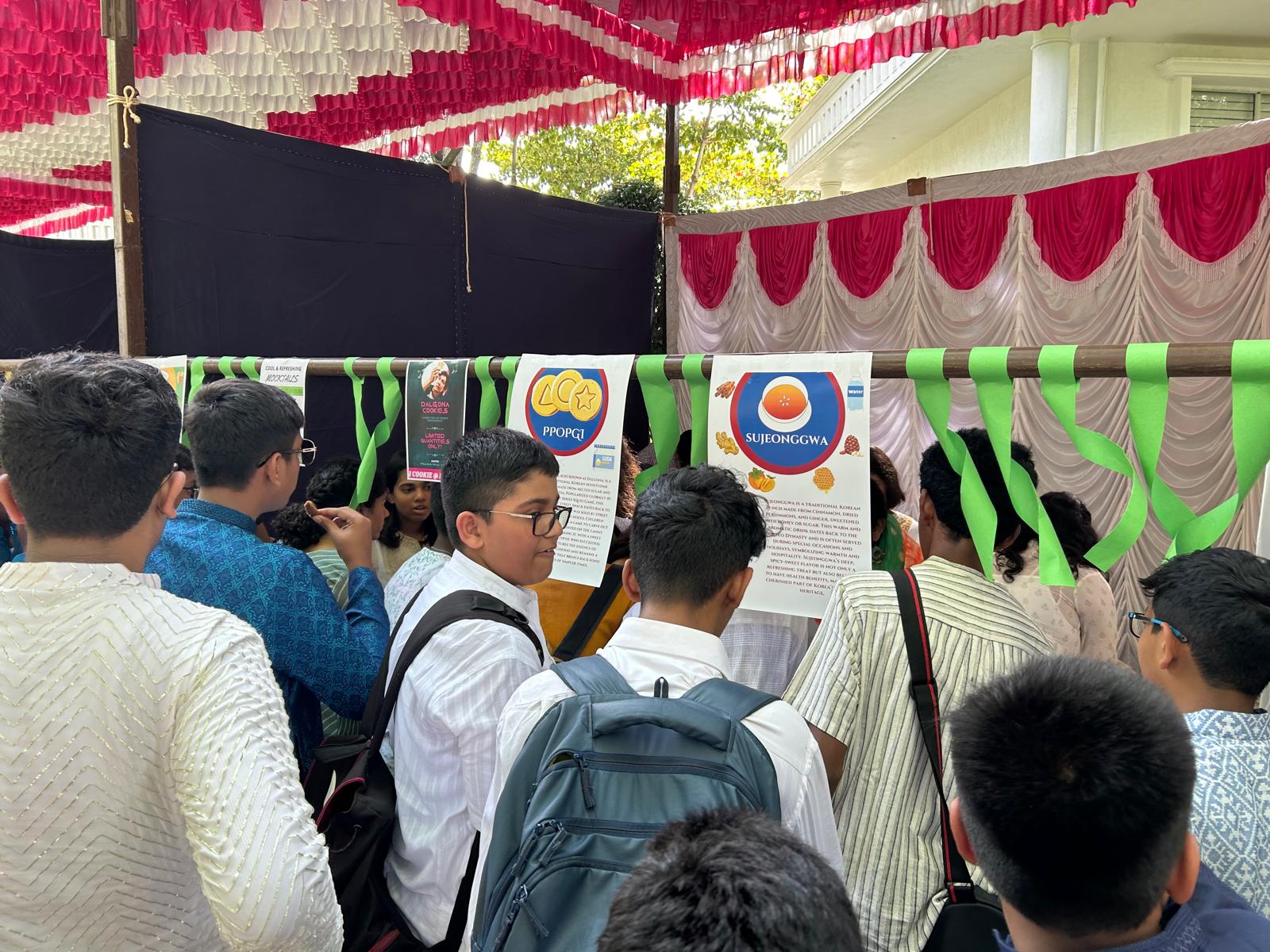 Due to India and South Korea having the same independence day, we held an event in Indus International School Bangalore celebrating both cultures! During this event we served food that had semi-direct parallels with one another, selling Korean Sujeongwa and coffee alongside Indian Mango Lassi. We continued this with popular street food such as Korean dalgona and Indian bhel puri.